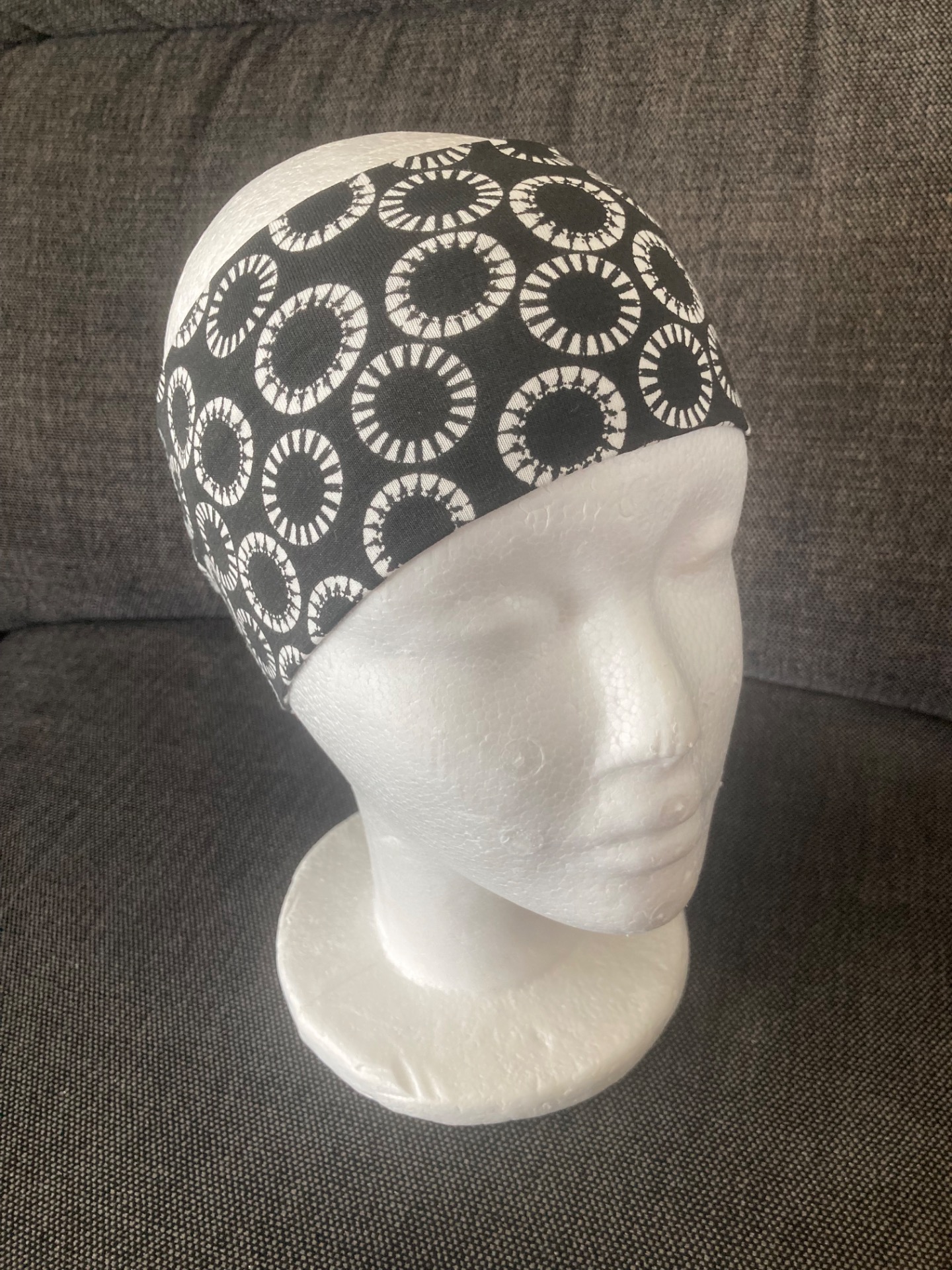 Látková černá čelenka s bílými kruhy. Foceno na hlavě, která má po obvodu 53 cm. Položená čelenka má rozměry 23 cm, výška 9 cm.