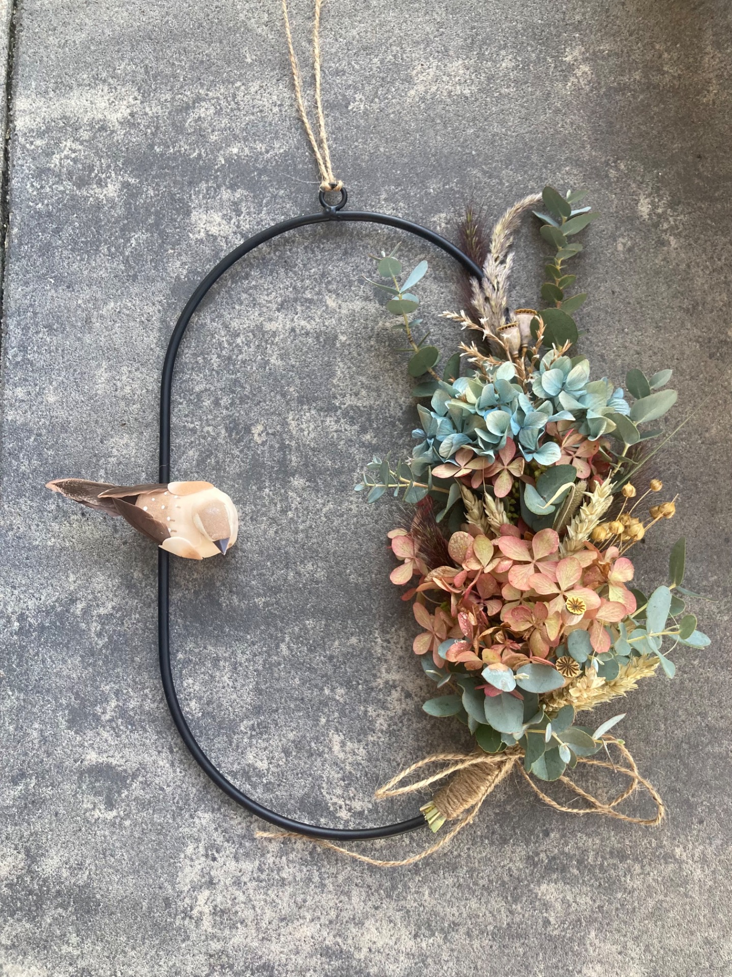 Kovový ovál zdobený sušenými květy a eukalyptem. Krásná podzimní dekorace.